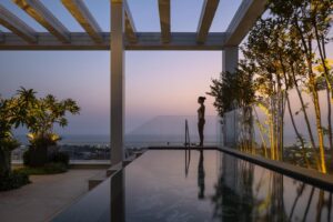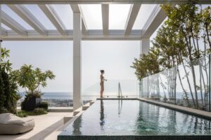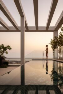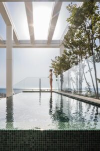 בריכת אינפיניטי – מחופה בפסיפס מסדרת Murano Smalto של Sicis, היוצרת מראה עוצר נשימה ומדגישה את תחושת היוקרה.