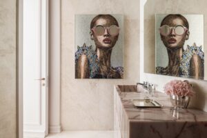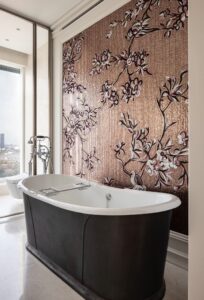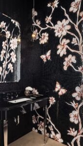 חדרי רחצה – שילוב אבן טבעית עם פסיפסי אומנות של Sicis, כולל עבודות יד ייחודיות בסגנון פרחוני צבעוני, ההופכות את הקירות ליצירות אמנות.